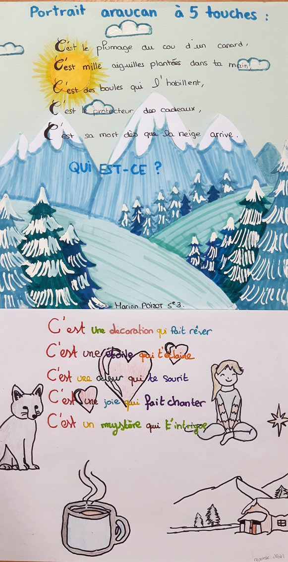 Les 5eme 3, avec leur professeur de français Mme Besson, ont réalisé des portraits araucans, à l’instar du jeu littéraire que l’indien Vendredi apprend à son ami Robinson Crusoé. L’exercice fait suite à l’étude du roman « Vendredi ou la vie sauvage » de Michel Tournier, qui fut d’ailleurs élève à Saint-Erembert à la fin des années 30.